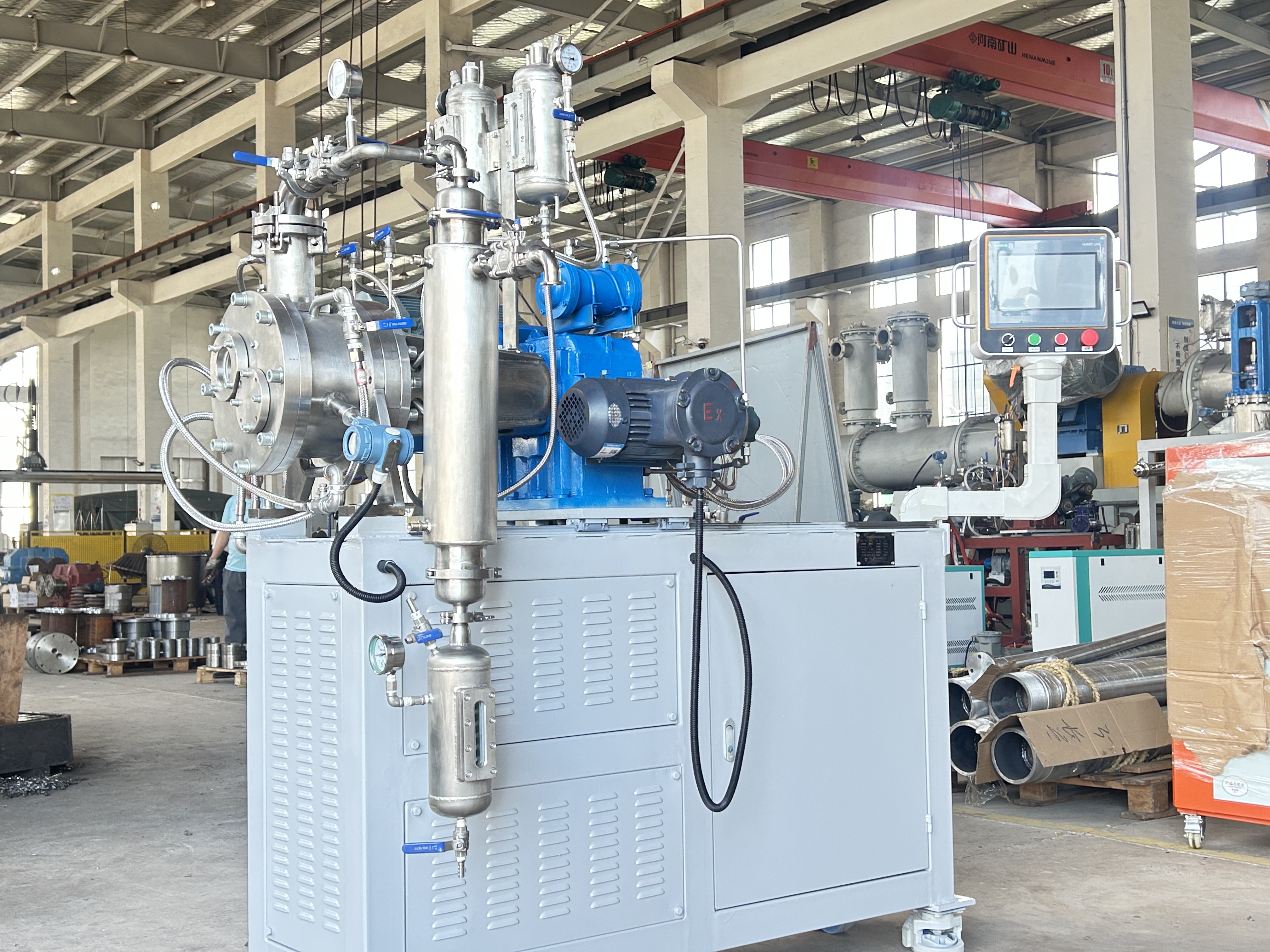 為了適應(yīng)在真空狀態(tài)下的操作,專門安裝了適用于高粘度物料的齒輪泵式出料器。該出料器直接安裝在主設(shè)備上,消除了設(shè)備內(nèi)的死角。齒輪泵式出料器在稍微超負(fù)荷的條件下工作,以保證物料能連續(xù)地排出,并輸入下一工段進(jìn)行包裝。